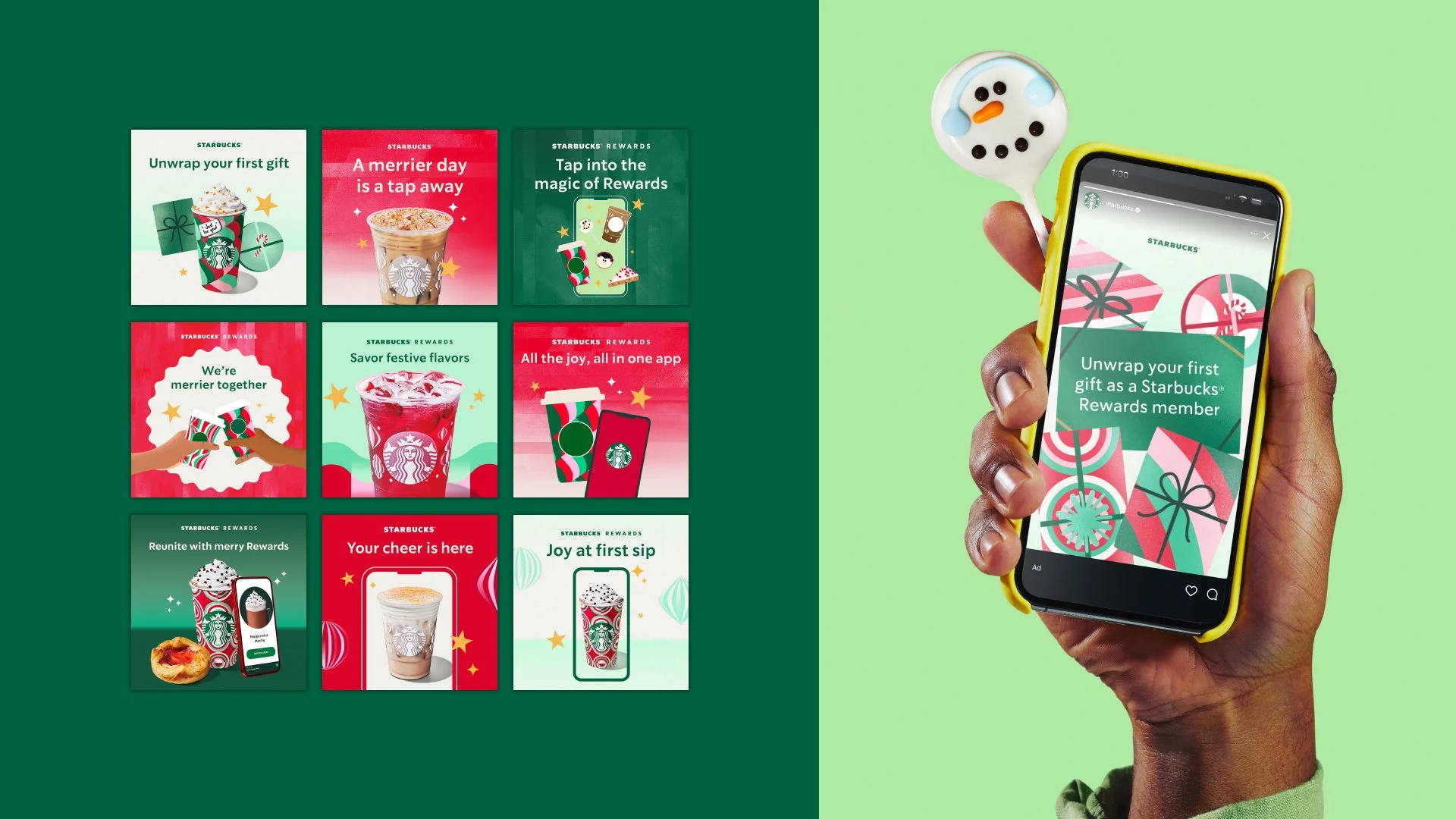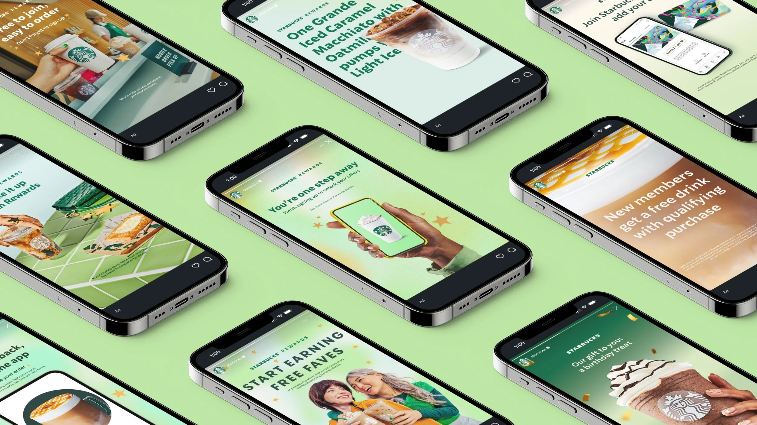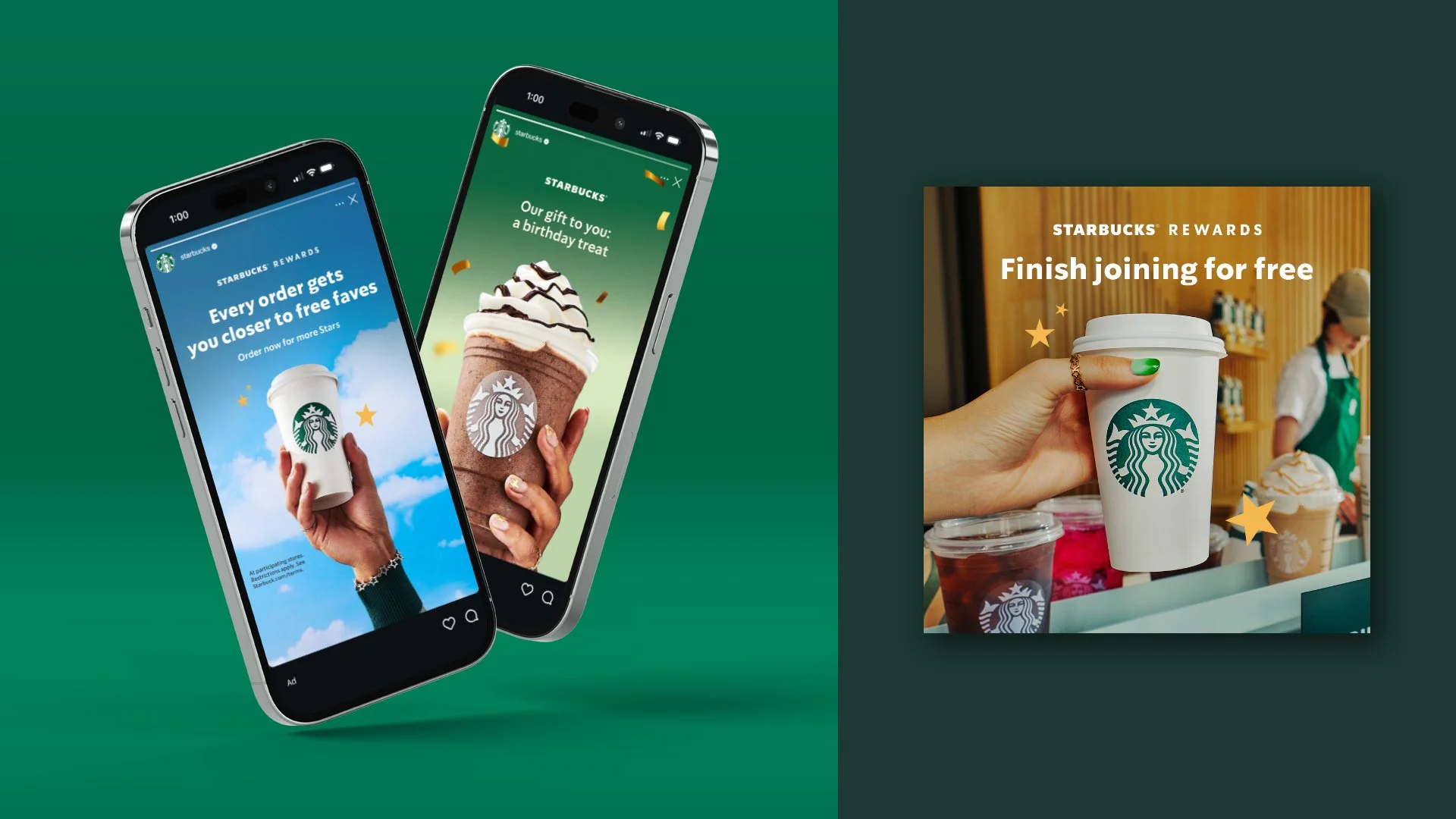 This work showcases a selection of paid media posts created for the Starbucks Rewards program. The creative was designed to build awareness of the platform and encourage customers to sign up to earn rewards and exclusive perks.